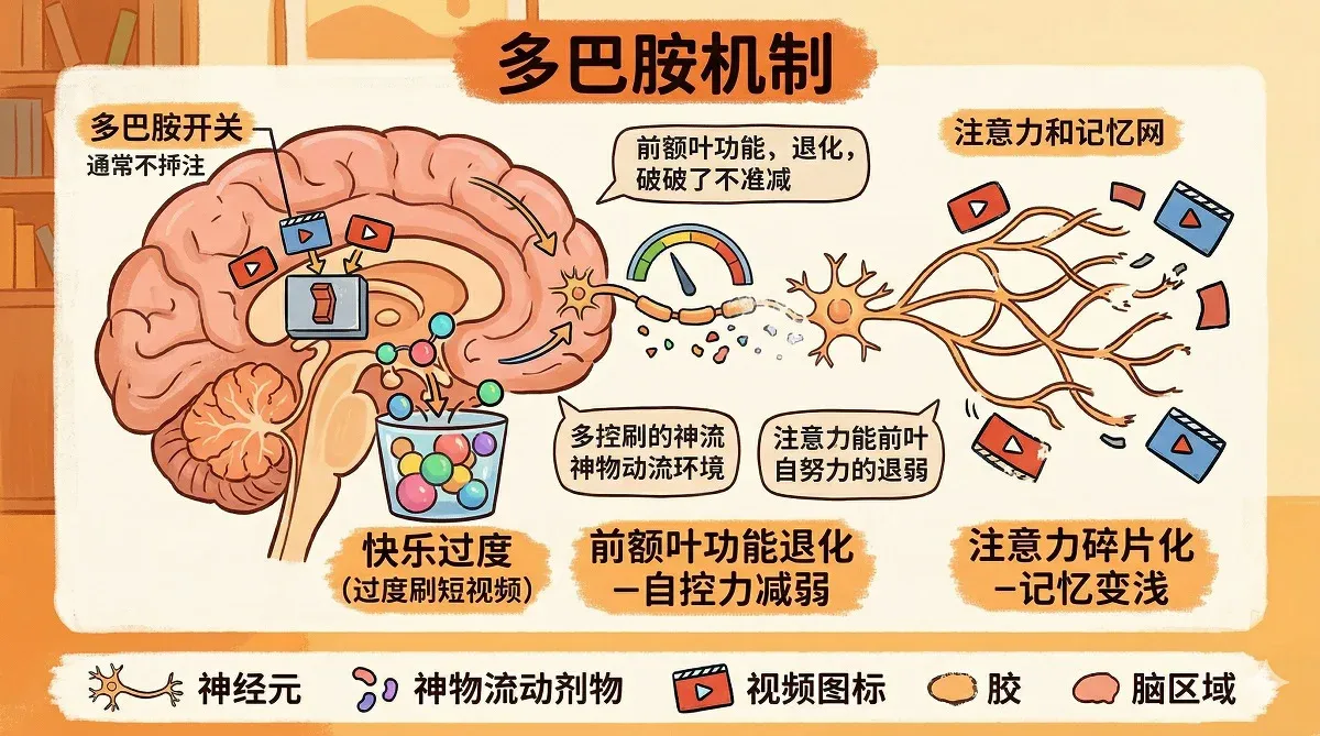 想象一下,大脑像一台精密电脑,前额叶是“CEO”,负责自控、计划和深度思考。短视频却像高糖快餐,不断狂按“多巴胺奖励按钮”。