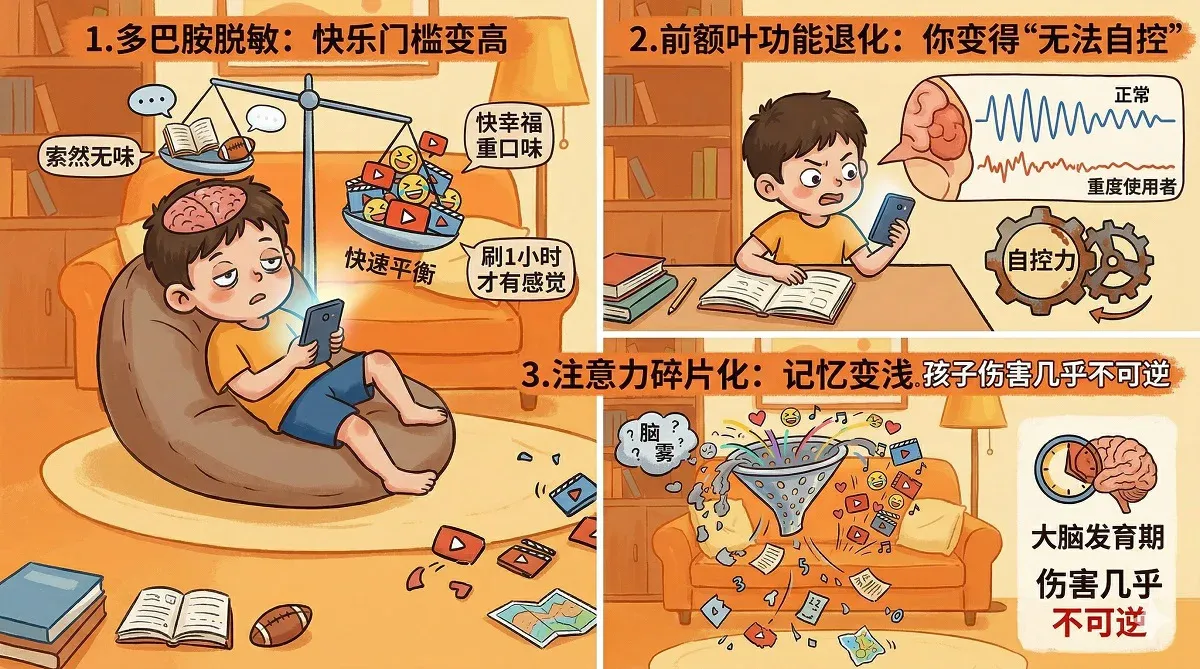 - 多巴胺脱敏:刚开始刷几分钟就开心,后来要刷更久才满足。大脑对正常生活的“慢快乐”(读书、聊天、运动)越来越没兴趣,像舌头吃糖吃麻了。