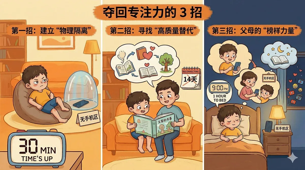- 亲子共管:和孩子一起定规矩——先完成作业/阅读,再刷视频。父母带头示范,别一边说孩子一边自己刷不停。