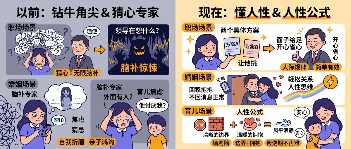 - 职场:领导说“随便”,我不再分析他心里想什么,直接按人性规律——给他两个具体方案,让他挑。面子给足,他开心,我也省心。