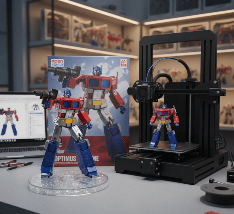 請將圖片轉換為收藏級手辦。在手辦後方,放置一個印有該手辦圖案及「open nana」名稱的手辦包裝盒。在其旁邊,添加一台正在列印該手辦的高階3D列印機。在該手辦包裝盒前方,放置一個圓形塑膠底座,放置手辦。