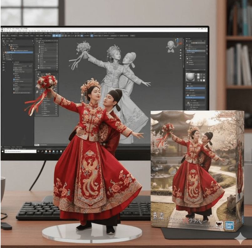 在電腦螢幕旁邊,放置一個印有原始藝術品的BANDAl風格玩具包裝盒。