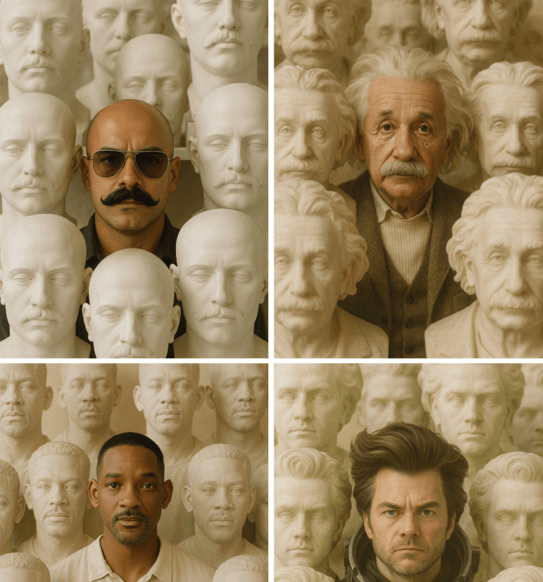 Prompt word:Ultra-real portrait of [CHARACTER] centered, surrounded by dozens of life-size stone busts of [CHARACTER]; warm beige museum lighting, matte alabaster texture, symmetrical composition, shallow depth of field (85mm), subtle film grain, 3:4 vertical, no text or watermark.