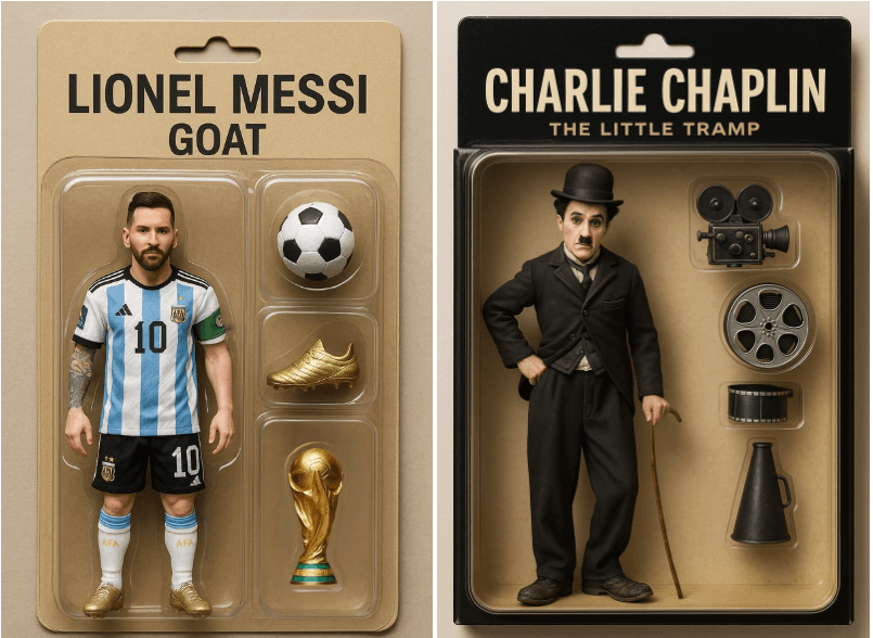 製作照片中人物的玩具,做成可動人偶。人偶旁邊要有玩具裝備,像是足球、足球鞋和世界盃獎盃。另外,在包裝盒上方寫上“LIONEL MESSI”,其下方寫上“GOAT”。請以寫實的風格呈現這畫面。