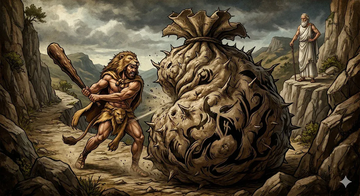 希腊神话里,海格力斯(大力士)有一天在路上走着,突然看到地上有个鼓鼓的袋子挡路。他觉得碍事,就上去踢了一脚。没想到,那袋子不但没被踢开,反而胀大了一倍。他生气了,用力又踢又砸,结果袋子越踢越大,最后把整条路都堵死了。