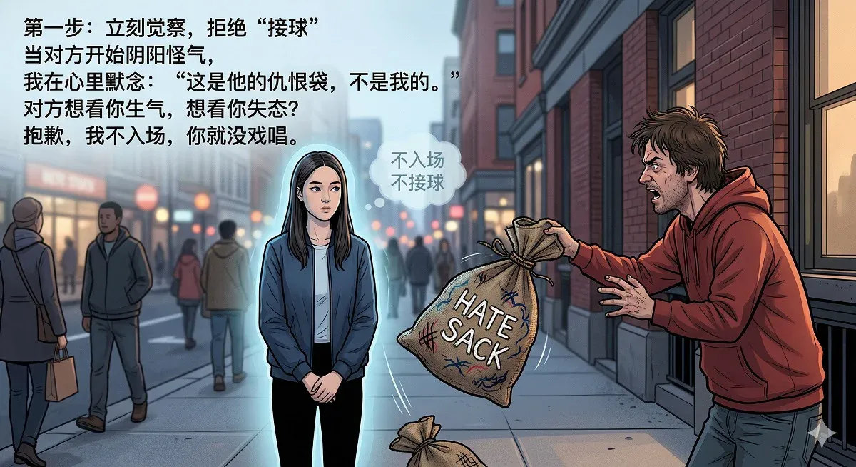 记住那句简单的话——别沟通,别愤怒,绕过那个“仇恨袋”,继续往前走就好。