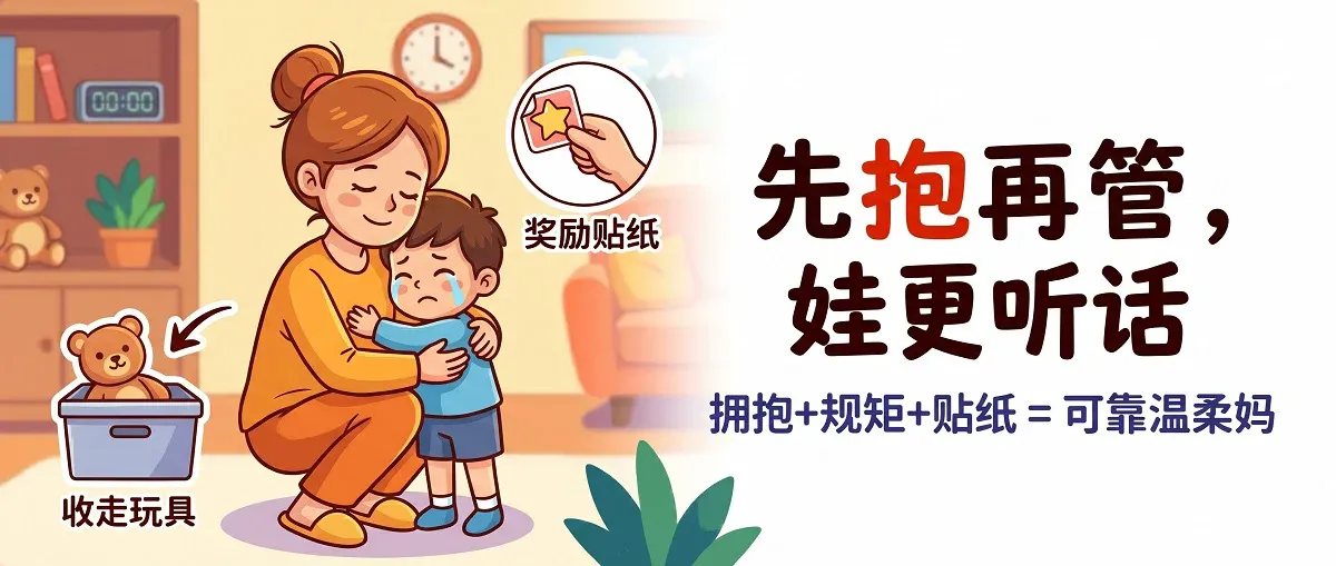 孩子犯错时,我先蹲下来抱抱他,真心说:“妈妈知道你现在很难过/想玩,但我还是要坚持这个规矩,因为我爱你。”