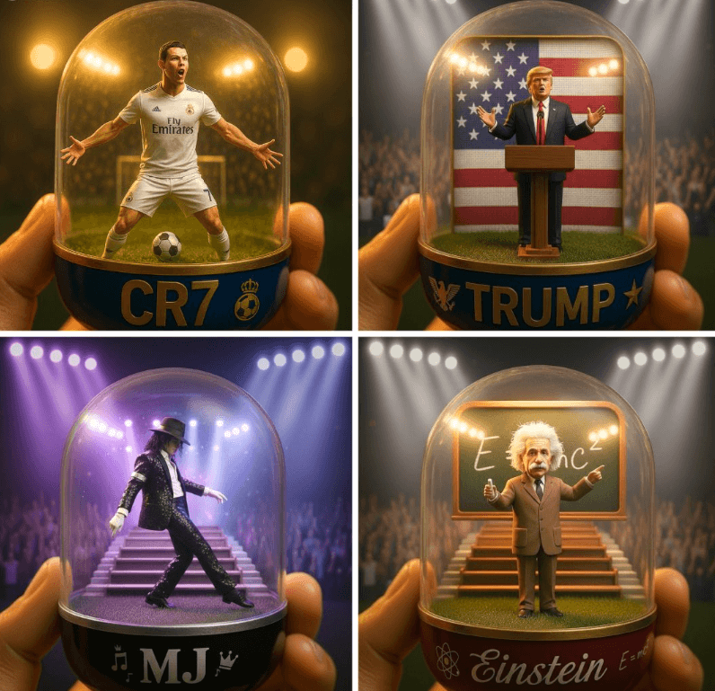 A detailed transparent gashapon capsule diorama, held between fingers, featuring [NAME] in their [ICONIC POSE / STYLE]. Inside: [short description of figure’s look, clothing, and accessories], with background elements such as [relevant setting: stadium, stage, lecture hall, etc.]. Lighting should be dramatic and cinematic, matching their theme (e.g., golden spotlight, concert glow, academic ambience). The capsule has a transparent top and a colored base (choose fitting color: e.g., royal blue, gold, black, red), decorated with [motifs related to the person]. The base is labeled with [NAME or NICKNAME] in a matching font style. The design should look like a miniature collectible, with photorealistic detail, soft bokeh, and a square 1080x1080 composition.